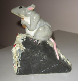Removing molds from a shape such as mouse taxes the latex itself to the limit. In addition to the flare at the cheeks, the ears and nose are oriented in different directions. The reinforced latex just barely stretches far enough to permit removal of the mold. The concrete is also stressed when the mold is removed, and must be completely cured to avoid breakage.