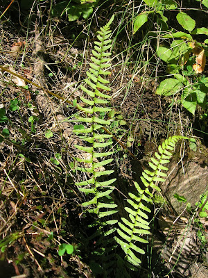 Many ferns are adept at eking out an existence in a harsh habitat. The Ebony Spleenwort (Asplenium platyneuron) makes do in small pockets of soil on rock faces and fissures, and it often has company. The long graceful fronds in the following photo are the fertile fronds of an Ebony Spleenwort. The smaller, more triangular fronds with the dissected leaflets belong to a Fragile Fern, and there's also a young Marginal Wood Fern in the picture. The plants with the rounded leaves (to the right of the photo) are the vernal rosettes of Early Saxifrage. An artistic arrangement tucked into a few square inches of soil lodged in a tiny crevice in the unyeilding granite, courtesy of Mother Nature.